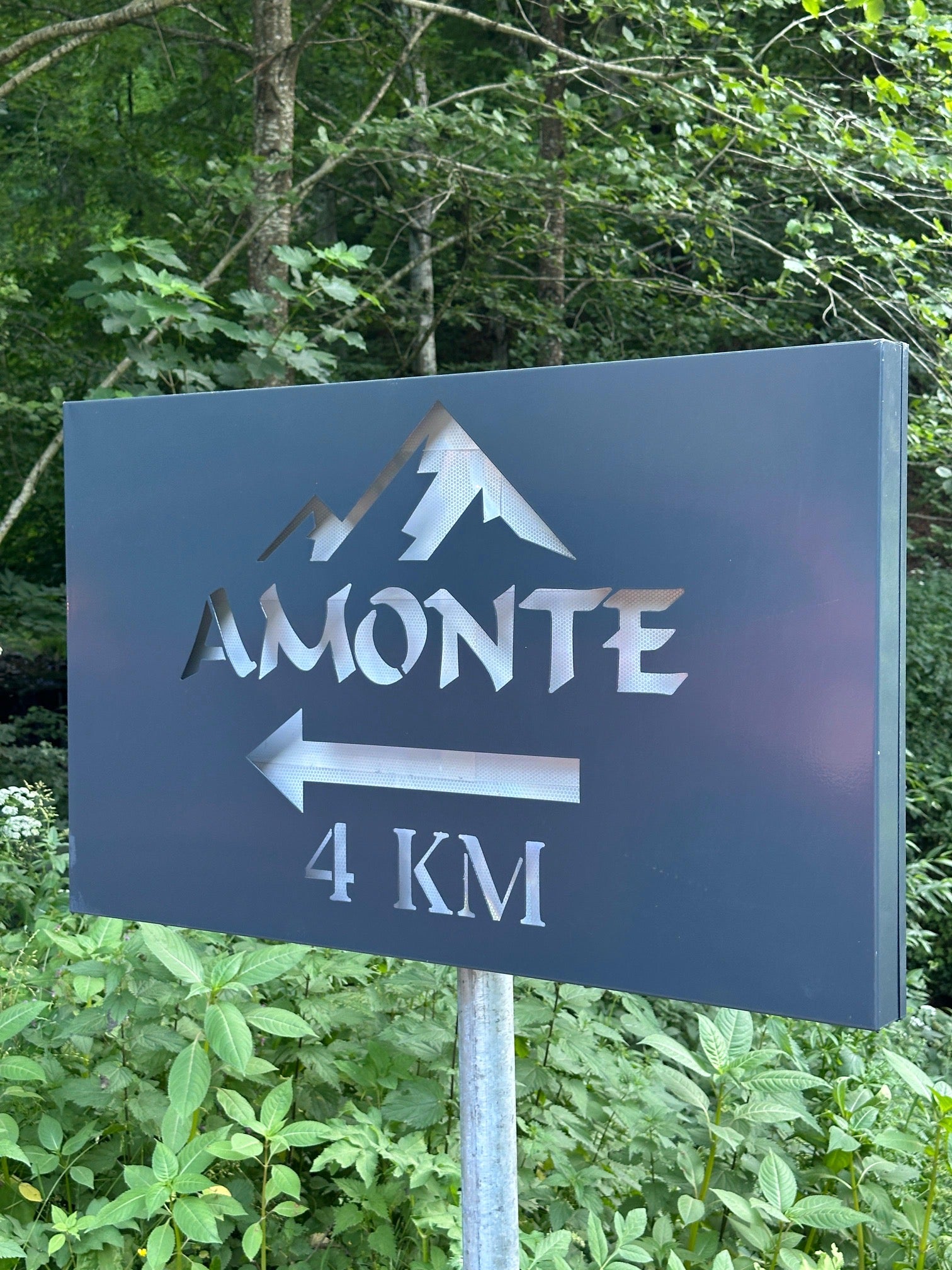 Realizat din metal durabil, acest semn poate fi personalizat cu textul dorit (ex: „Amonte”, distanță, săgeată, simboluri) și are un design elegant. Rezistent la intemperii și ușor de montat pe stâlp sau perete.